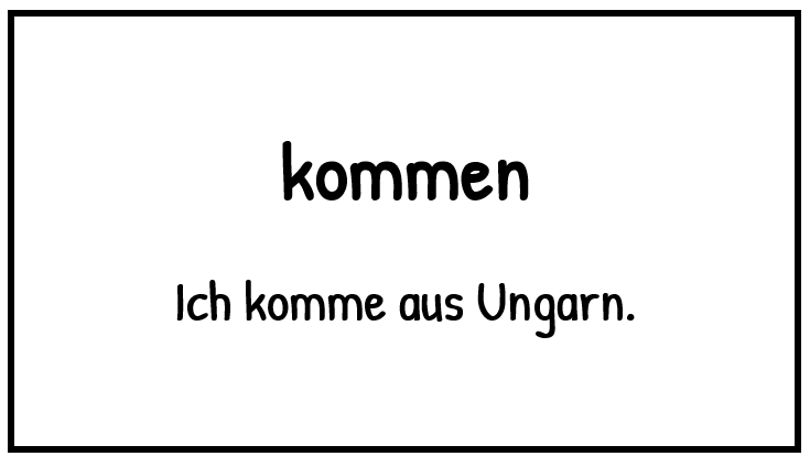 Elsőként nézzük a német igéket. Kezdőként koncentrálj a jelen időre! Nem kell rögtön megtanulnod az ige múlt idejű és egyéb alakjait. Érdemes azonban példamondatokkal vagy rövid kifejezésekkel is kiegészítened kártyáidat: